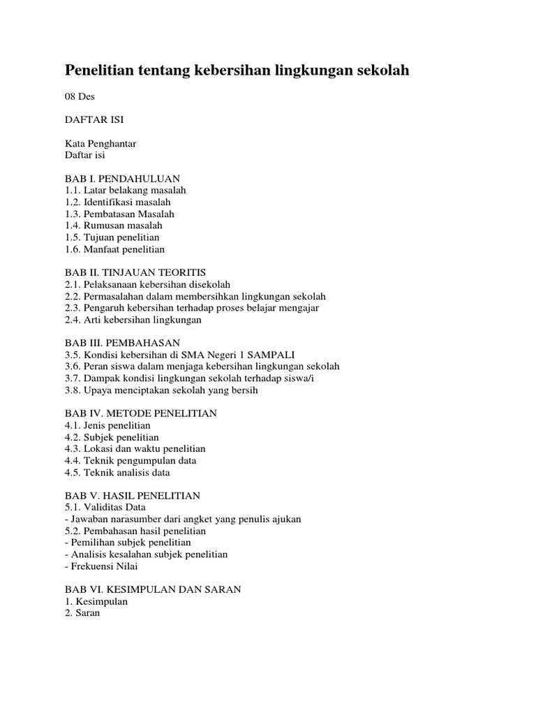Didalam karya ilmiah ini, penulis akan juga menjelaskan hasil penelitian di lapangan yang dimulai dengan bab pendahuluan. Tema proposal = penghijauan, kebersihan, serta kerapian dalam sistem tata letak ruangan. Penelitian ini merupakan penelitian deskriptif kuantitatif. Kebersihan lingkungan sekolah menjadi tanggung jawab semua siswa. 1 pencayaan ruangan guru bagus, di depan ruang c.
